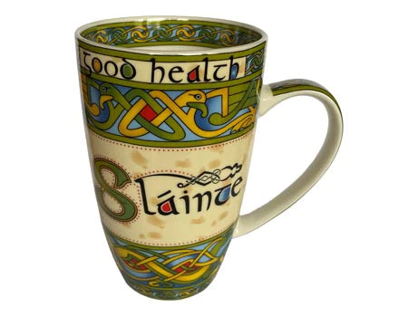 his bone china mug depicting the Irish toast 'good health' is designed in the style of 9th century ancient Celtic manuscripts which would have been painted by monks onto vellum or calf skin.