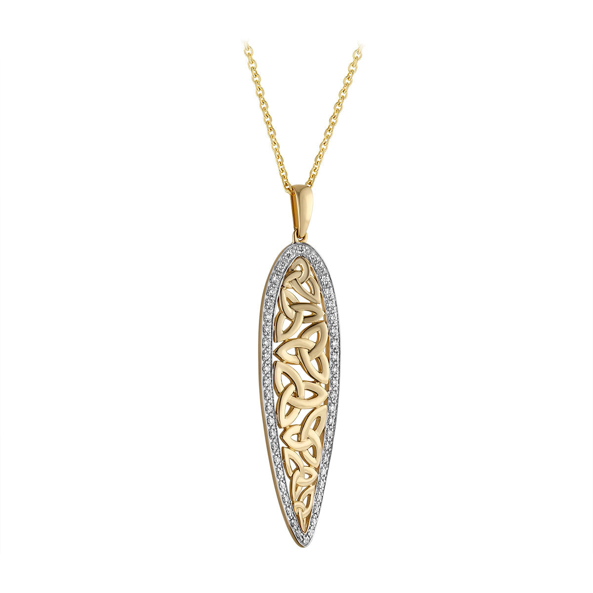 This elegant 14k gold Twist Trinity Knot necklace features the Trinity Knot, one of the most recognisable symbols of Celtic culture. The numerous Trinity Knot symbols are arranged in a twisted shape and inlayed with diamond and a white gold frame.S46789