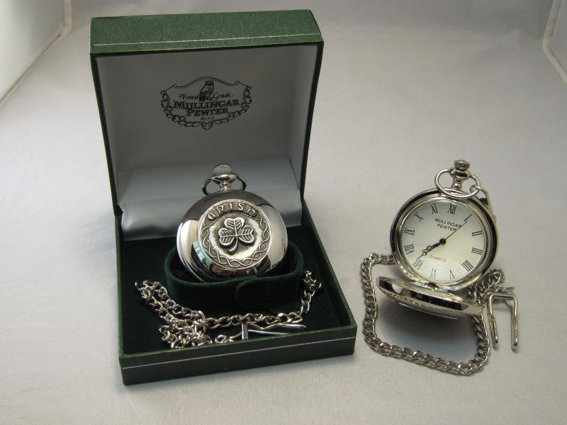 Mullingar Pewter Shamrock Pocket Watch is handmade by Mullingar Pewter in County Westmeath, Ireland