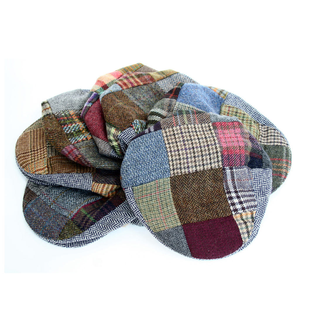 Child’s Patch Cap, One Size, Elastic Backed. Every patch cap is unique. Patches of tweed are sewn together to make this eye-catching cap. Caps will vary from the image shown. This picture shows a selection of caps to illustrate the variety available. This vesrion especially made for children is a smaller crown size and peak and has ELASTIC in the back seam so that it will fit a wide variety of head size. It is a very popular model and a lovely unique gift for a child.
