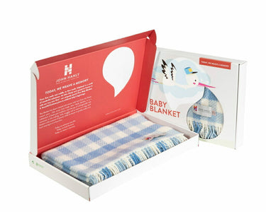 Irish Cashmere Baby Blanket Blue Block Check. A gorgeously soft cashmere blend baby blanket, a beautiful heirloom celebrating baby’s beginnings, comes in a specially designed gift box. 95% Merino Wool 5% Cashmere.