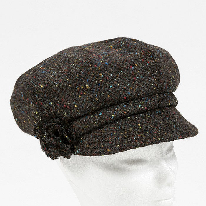Ladies Tweed Hat Brown Turquoise Herringbone Donegal with Rosette