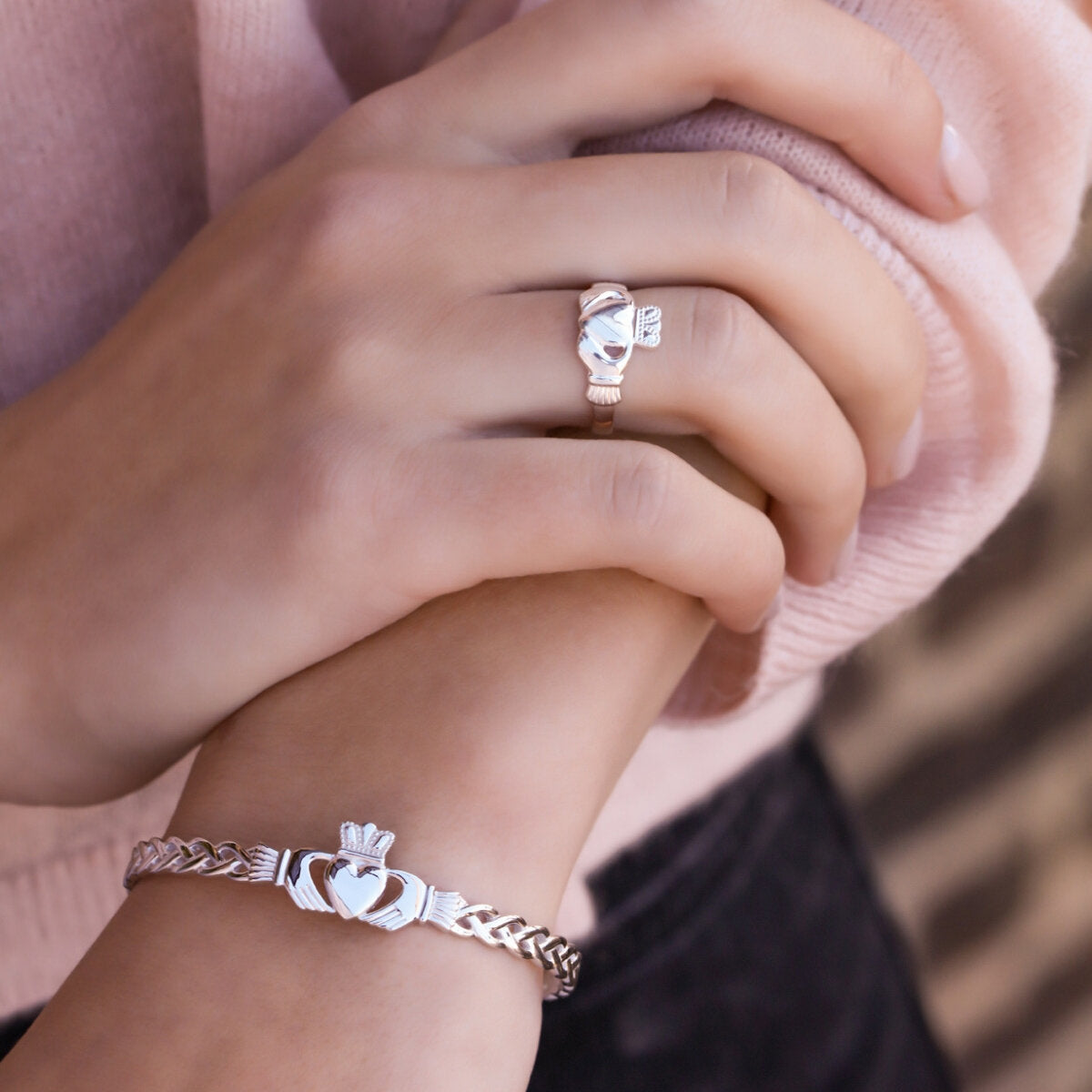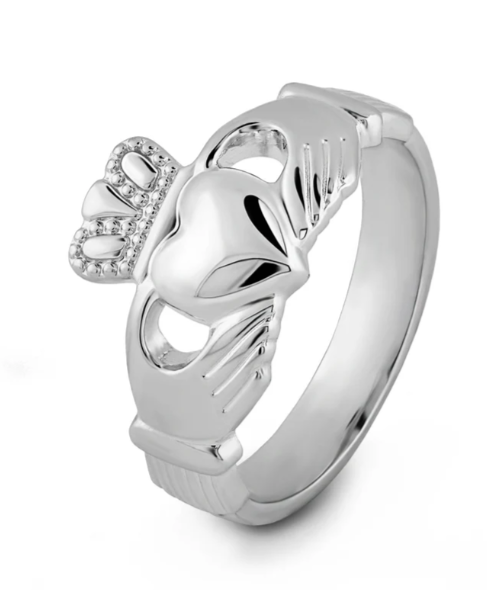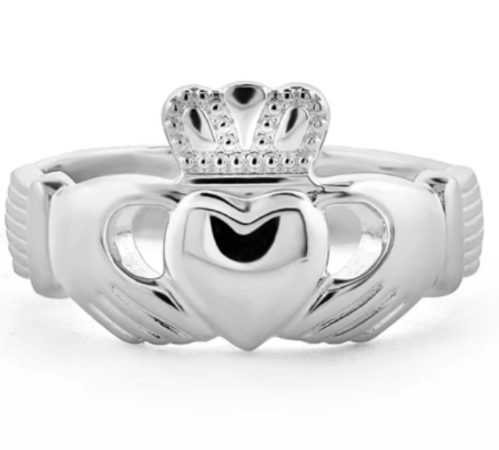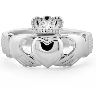The story of the Claddagh on this ring is a tale of eternal devotion. Its design echoes the words of the Irish sailor who first crafted it for his sweetheart “With these hands I give you my heart, and I crown it with my love”, and it's symbols represent love (heart), friendship (hands) and loyalty (crown). This precious ladies sterling silver, Claddagh ring has been Irish hallmarked in Dublin Castle.