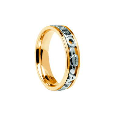 This wedding band features the inscription "Mo Anam Cara" or "my soul mate". The ring features white gold text on a yellow gold band.