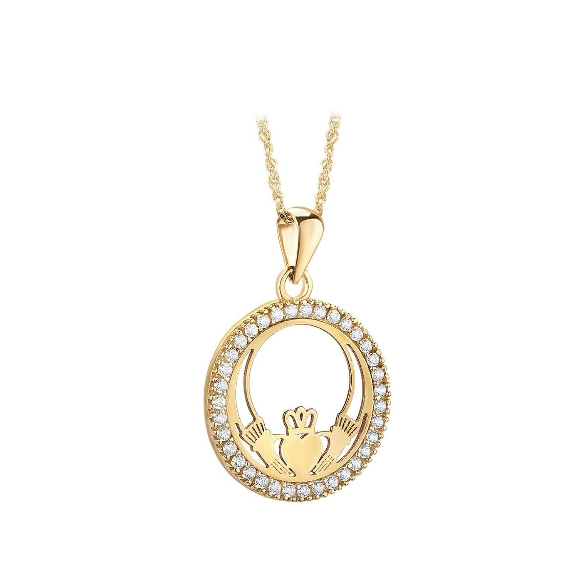 This 10K gold claddagh necklace is designed in a disc shape with a surround of cubic zirocnias. The calddagh is an irish symbol representing love, loyalty and friendship. This piece has been Irish hallmarked by the Assay office at Dublin Castle and comes with a 18 inch 10k delicate sing chain.