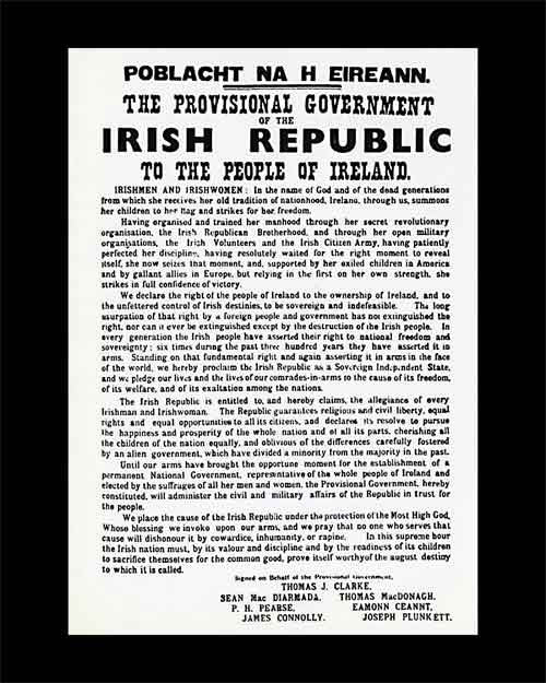 The 1916 Proclamation or Easter Proclamation, was a document issued by the Irish Volunteers and Irish Citizen Army during the Easter Rising in Ireland, which began on 24 April 1916. In it, the Provisional Government of the Irish Republic, proclaimed Irish independence from Britain.