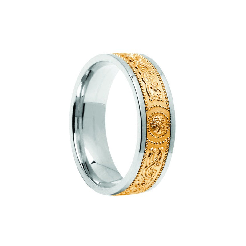 Ladies and men's Celtic warrior shield wedding band, featuring yellow gold with a silver trim.