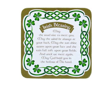 This wooden, cork-backed coaster depicts what is probably the most popular and widely known of our traditional Irish blessings. The wording is surrounded by shamrocks, the symbol of Ireland, and the never ending interlacing of Celtic knotwork.