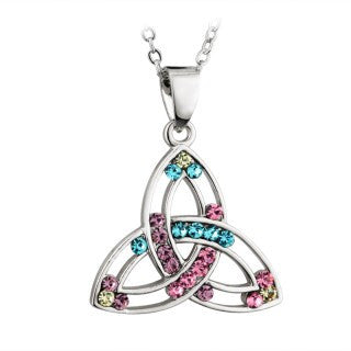 Rhodium Plated Celtic Trinity Knot Necklace Pendant with Multi-Colored Pastel Crystals on a 45cm (18inch) chain